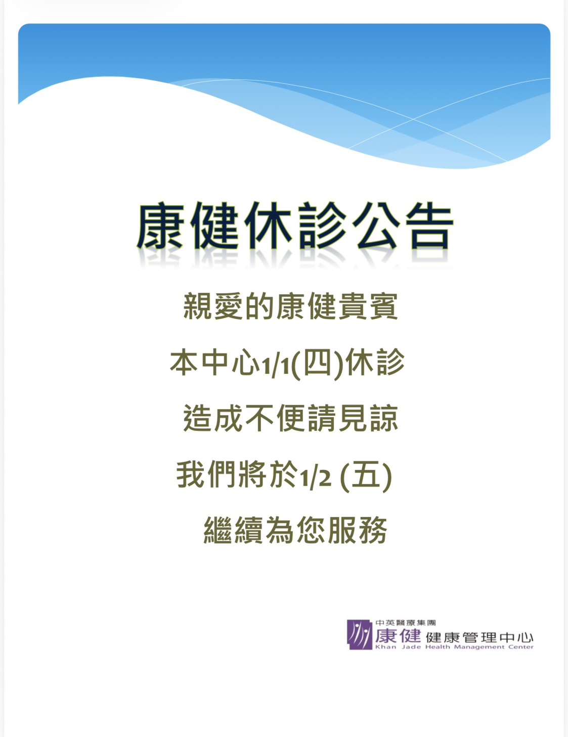 康健休假公告